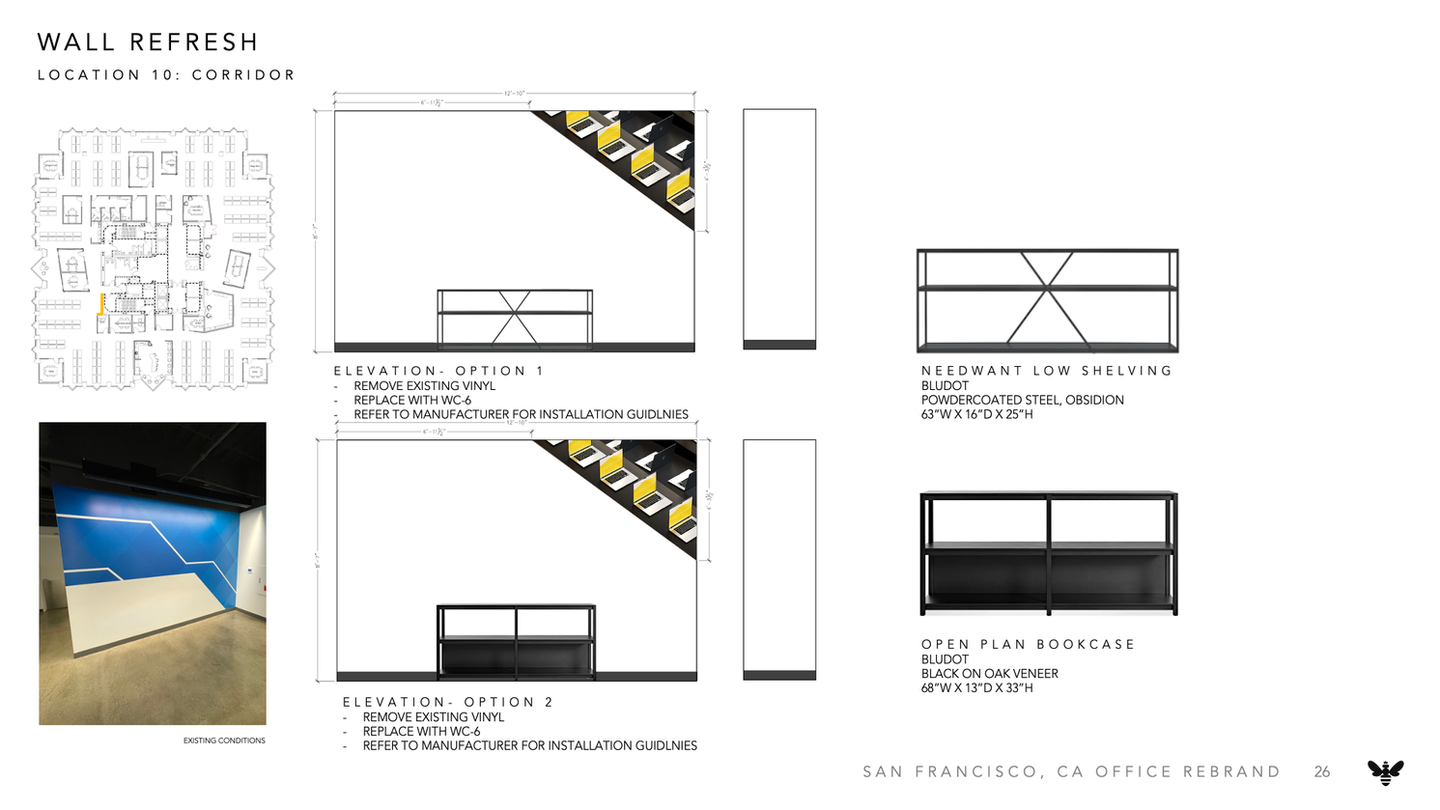 Create custom branding elements such as wayfinding graphics, art, elevator lobby features, conference room names and graphics.